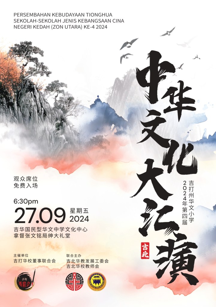2024年第四届吉打州华文小学中华文化大汇演 诚挚邀请大家出席2024年第四届吉打州华文小学中华文化大汇演,一起感受中华文化的魅力与韵味! 优雅风采传统舞蹈 绚丽动人古典音乐 中华武术精湛技艺 民俗技艺灵动扯铃 怎能错过这么精彩的演出! 最重要的是 免费入场!免费入场!免费入场! Share this: Share on X (Opens in new window) X Share on Facebook (Opens in new window) Facebook Share on WhatsApp (Opens in new window) WhatsApp Like Loading...